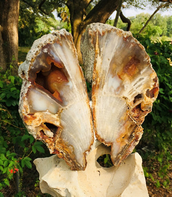 In some cases, the agatization process continued and the entire cavity became filled. In other, rarer instances, the head remained hollow with the agate simply coating the inside. This results in relic structures of the coral becoming encased in amber-colored agate. “Agatized Coral” is an often-misused phrase applied to nearly any coral which contains quartz in its replacement. Such corals are found in various strata and are known from several locations and ages around the world. However, there are only two places where large, truly-agatized, hollow specimens of this type are found: One is in certain water channels of Tampa Bay, the other is in southern Georgia. In both locations finding choice specimens has become exceedingly difficult.