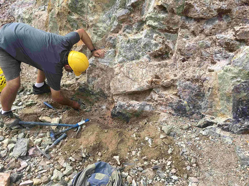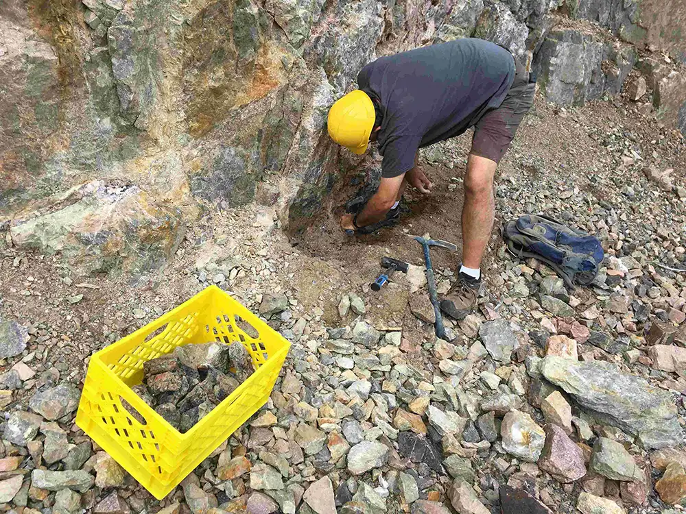 As field geologists, we knew if a productive vein outcrops in one place, then usually others can be found in the region – maybe not right nearby, but somewhere in the area there was bound to be more. And, sure enough, after a couple hours trekking around the area, we found some promising veins of fluorite.